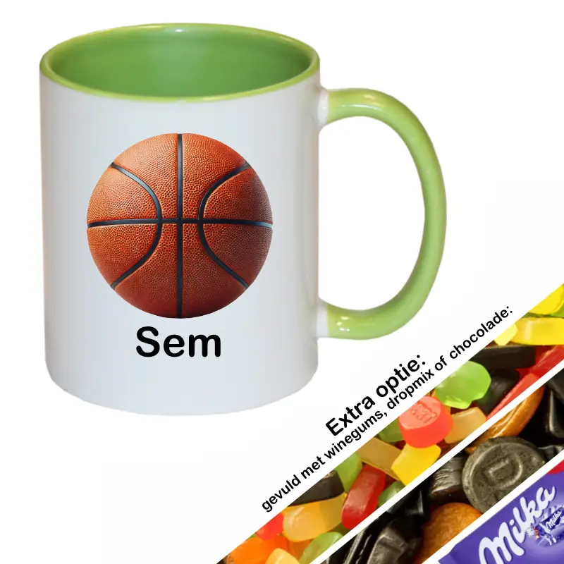 Onze basketbal mokken zijn beschikbaar in diverse kleuren, zodat je altijd een mok vindt die bij je past of bij degene aan wie je de mok cadeau wilt geven. Bovendien is het mogelijk om de mok te laten vullen met heerlijke traktaties zoals winegums, dropmix, Milka chocolade, of om deze te laten verpakken in feestelijk cadeaufolie. Zo wordt het nog leuker en feestelijker om deze gepersonaliseerde mok cadeau te doen.