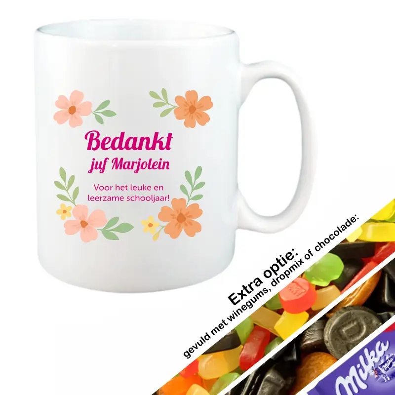 Maak het bedankje nóg feestelijker door de mok te vullen met iets lekkers! Denk aan heerlijke thee, chocolaatjes of snoepjes – een kleine verrassing die het cadeau extra speciaal maakt. De mok wordt feestelijk verpakt in transparante cadeaufolie, zodat het direct klaar is om te geven. Een dankbaar gebaar dat gegarandeerd in de smaak valt!