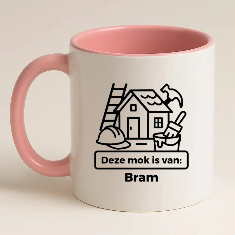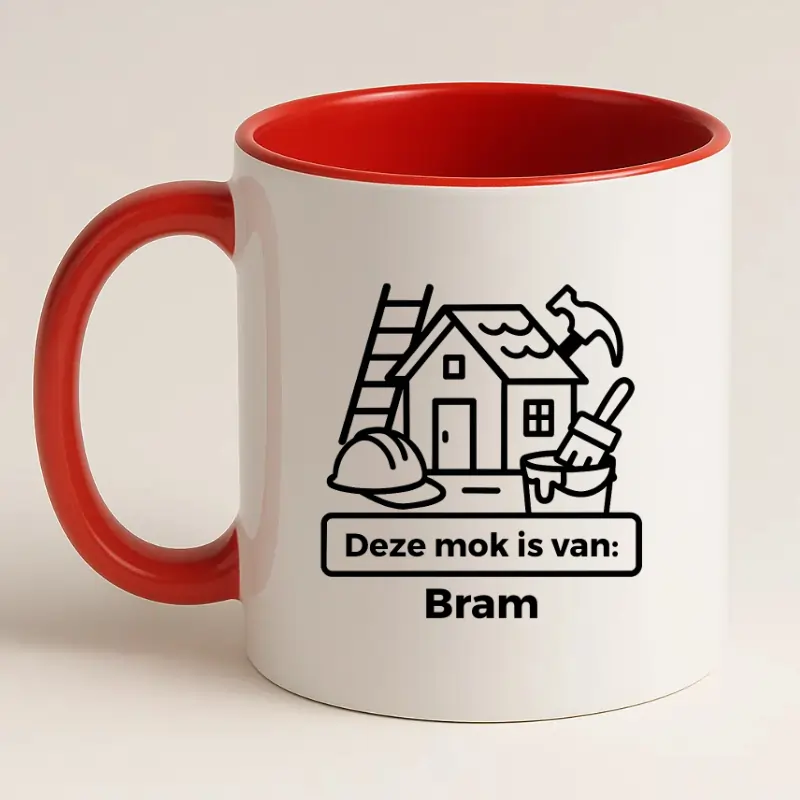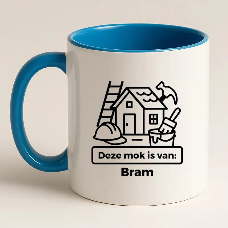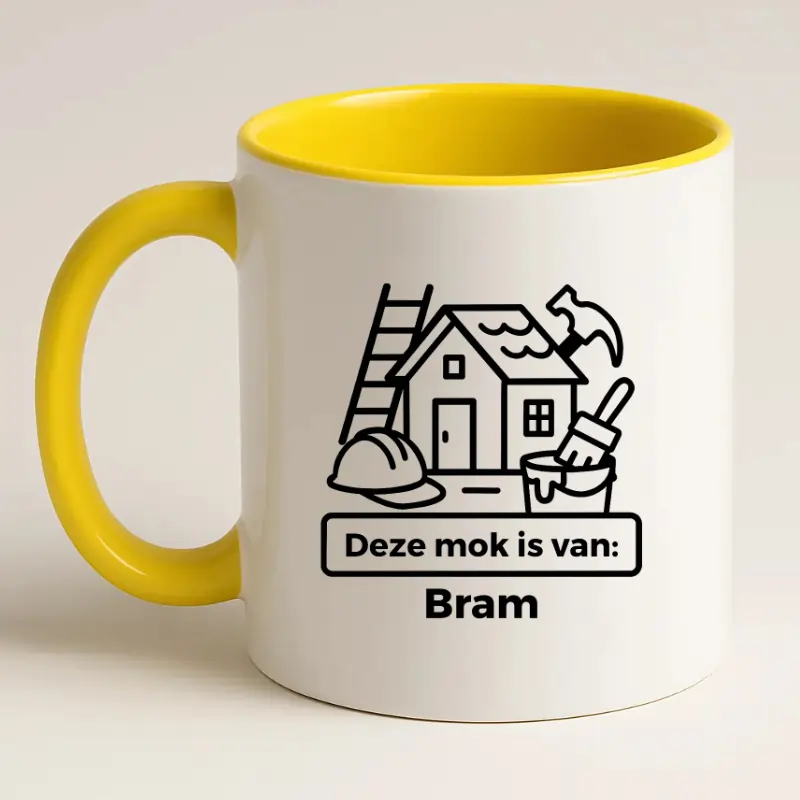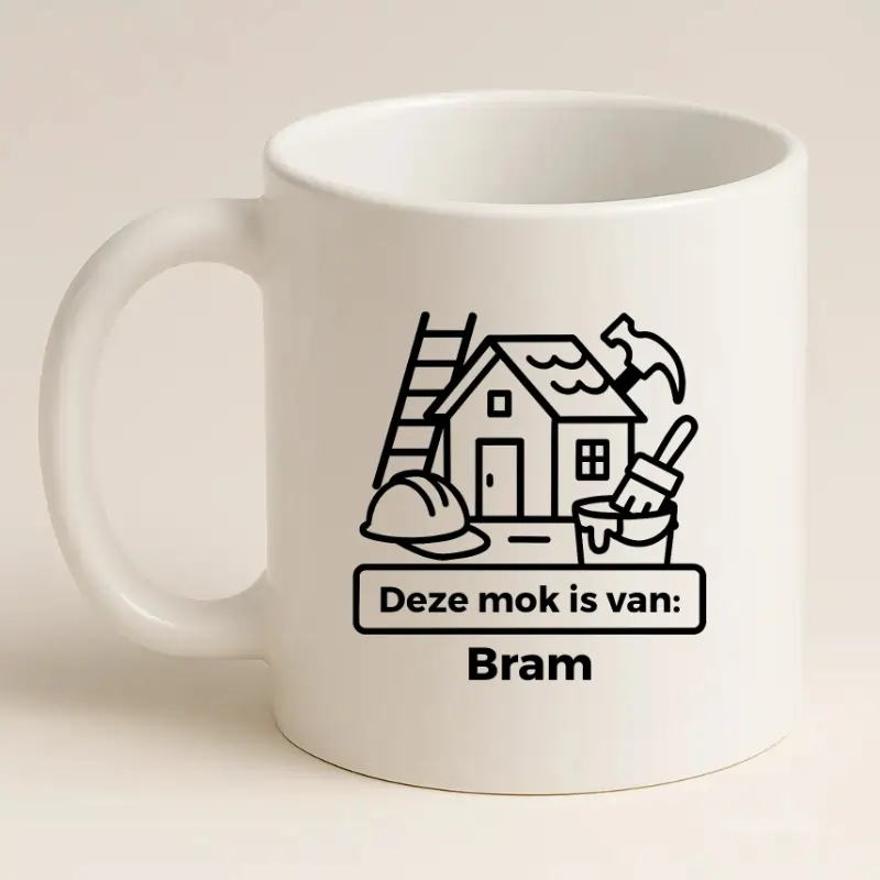Op deze gepersonaliseerde mok voor klussers staat de tekst “Deze mok is van…” met daaronder de naam van de ontvanger. De mok is versierd met herkenbare klus-iconen zoals een bouwhelm, huis, ladder, hamer en verf met kwast. Zo wordt een simpele koffiemok omgetoverd tot een uniek en persoonlijk cadeau voor de echte klusser.