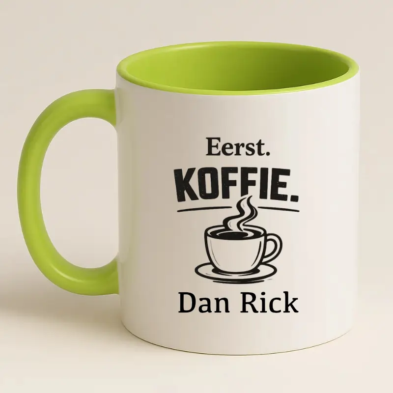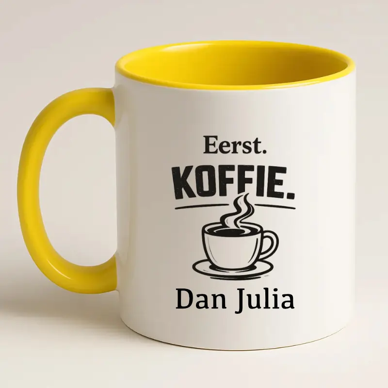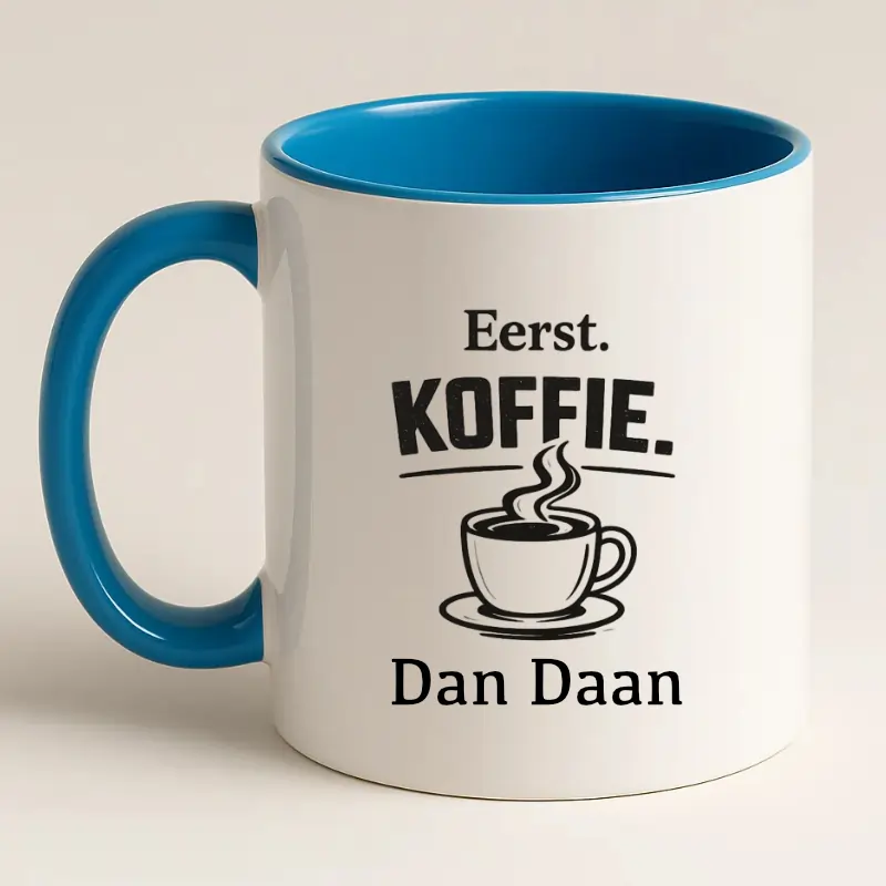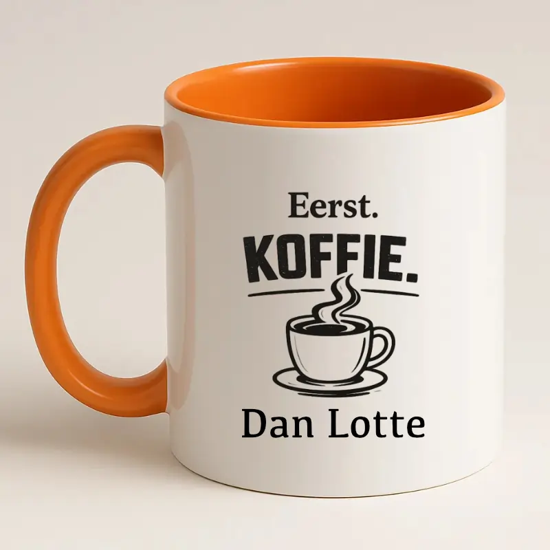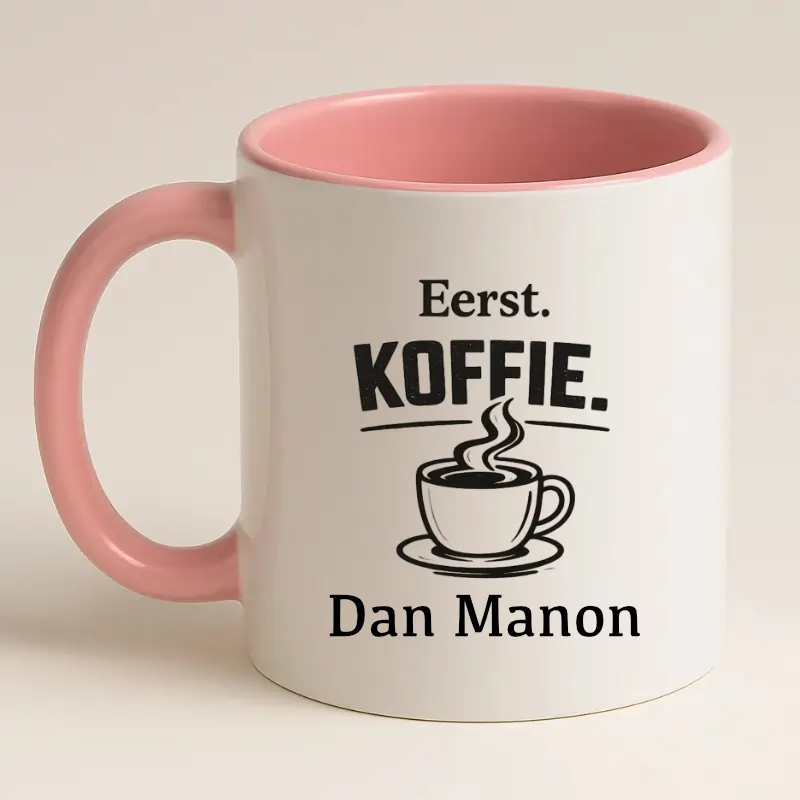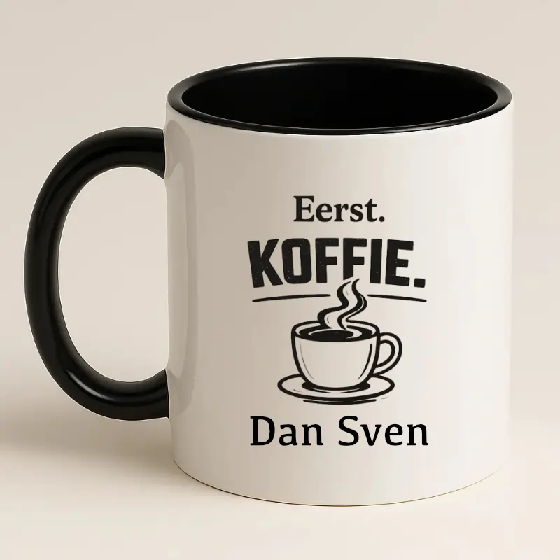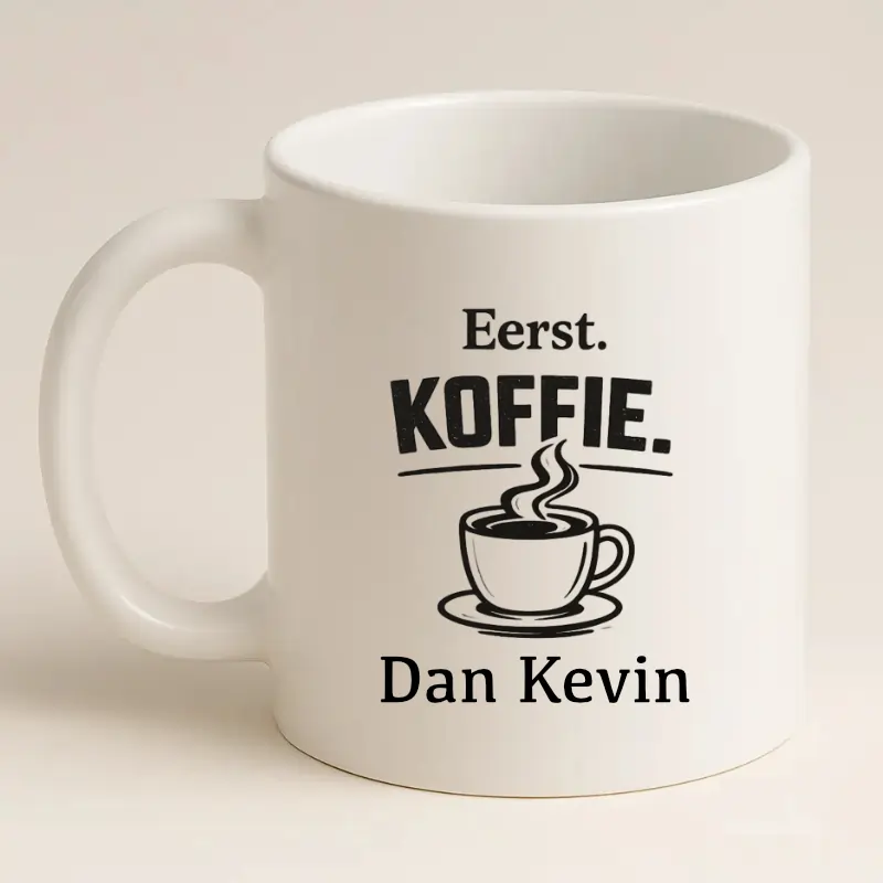 Op de mok staat Eerst Koffie. Dan ……. gecombineerd met een subtiel koffie-icoon. De naam wordt speciaal voor jou gepersonaliseerd, waardoor deze koffiemok niet alleen grappig is, maar ook persoonlijk. Ideaal voor koffiedrinkers die hun ochtendritueel serieus nemen.