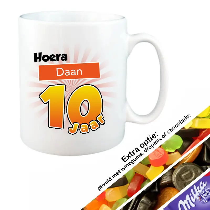 De naam die je invult in het invulveld “naam” hierboven wordt verwerkt in het ontwerp op de mok. Vul je de naam Daan in, dan komt er op de mok te staan: Hoera, Daan 10 Jaar