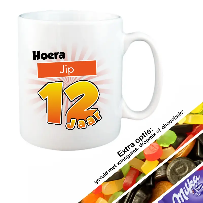 De naam die je invult in het invulveld “naam” hierboven wordt verwerkt in het ontwerp op de mok. Vul je de naam Jip in, dan komt er op de mok te staan: Hoera, Jip 12 Jaar