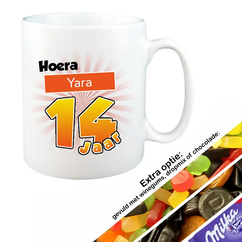De naam die je invult in het invulveld “naam” hierboven wordt verwerkt in het ontwerp op de mok. Vul je de naam Yara in, dan komt er op de mok te staan: Hoera, Yara 14 Jaar