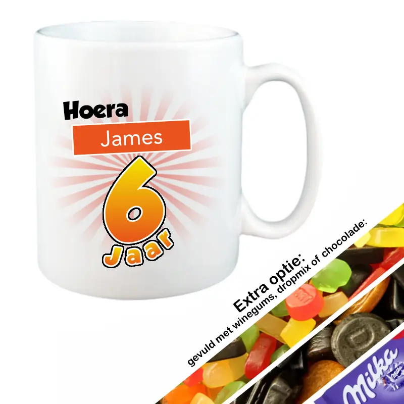 De naam die je invult in het invulveld “naam” hierboven wordt verwerkt in het ontwerp op de mok. Vul je de naam James in, dan komt er op de mok te staan: Hoera, James 6 Jaar