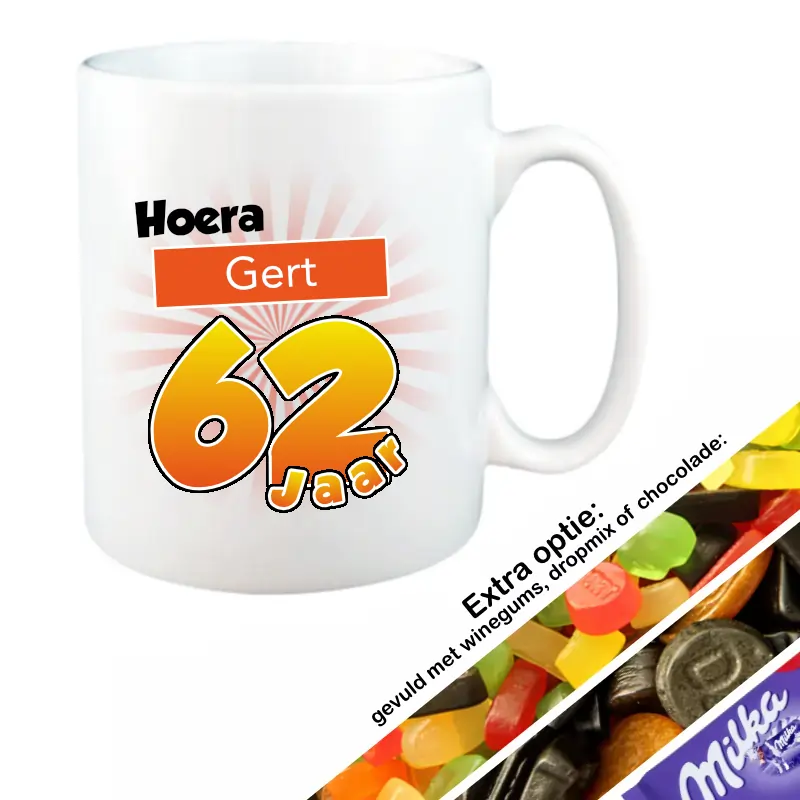 De naam die je invult in het invulveld “naam” hierboven wordt verwerkt in het ontwerp op de mok. Vul je de naam Jasmijn in, dan komt er op de mok te staan: Hoera, Jasmijn 62 Jaar