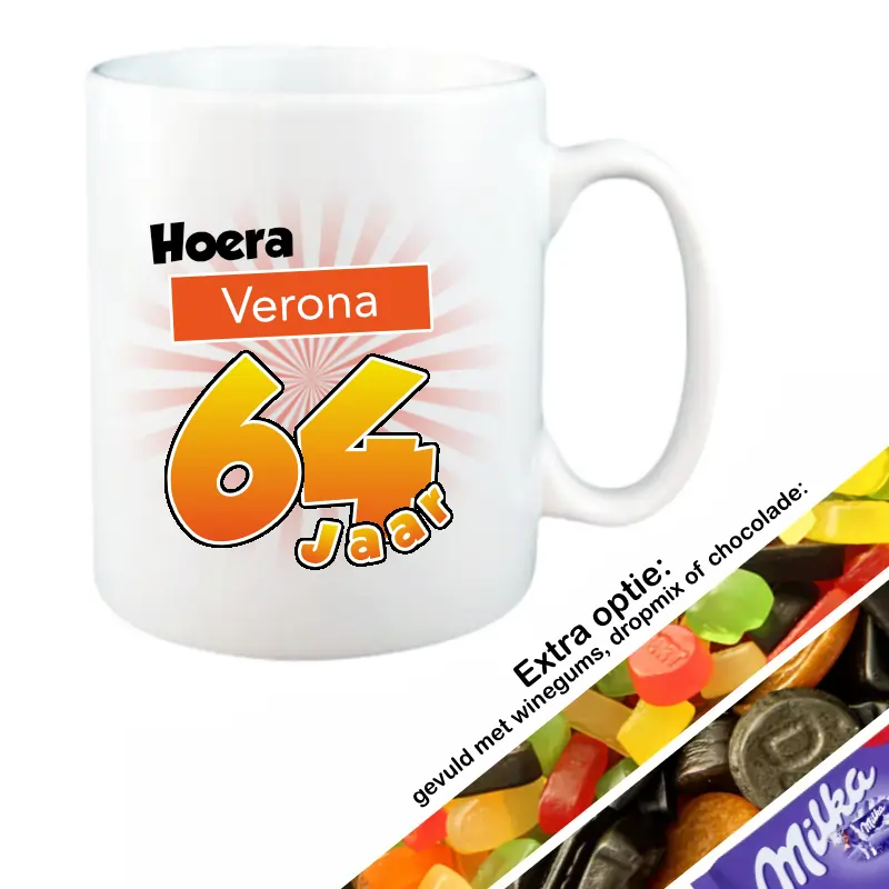 Zoek je een leuke mok voor iemand die 64 jaar wordt? Deze originele mok bedrukt met naam een leeftijd is niet alleen leuk, maar ook super handig, omdat je eigen naam en leeftijd erop gedrukt wordt weet je altijd dat deze mok van jou is.