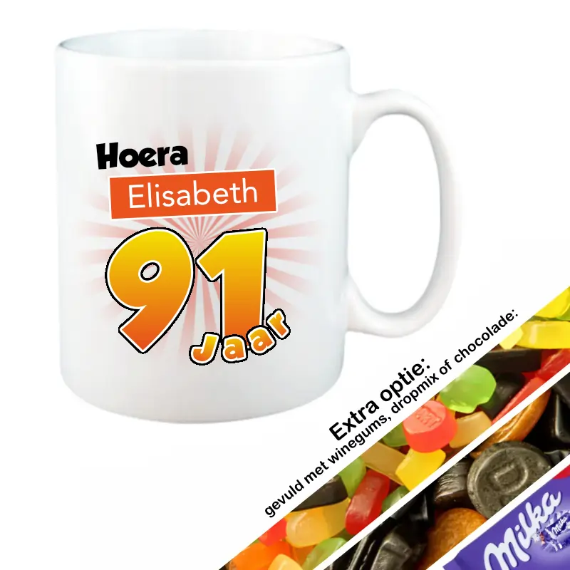 De naam die je invult in het invulveld “naam” hierboven wordt verwerkt in het ontwerp op de mok. Vul je de naam Jasmijn in, dan komt er op de mok te staan: Hoera, Jasmijn 91 Jaar