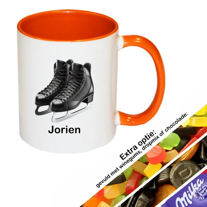Schaatsen mok met naam (oranje) Watzalikkopen.nl