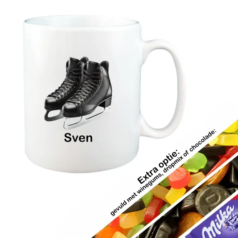 Als extra optie kan de mok feestelijk ingepakt worden in cadeaufolie, wat het cadeau nog specialer maakt. Daarnaast kun je de mok laten vullen met snoep naar keuze: kies uit winegums, dropmix, of Milka chocolade. Deze extra’s maken de schaatsen mok met naam niet alleen een prachtig geschenk, maar ook een smakelijke verrassing.