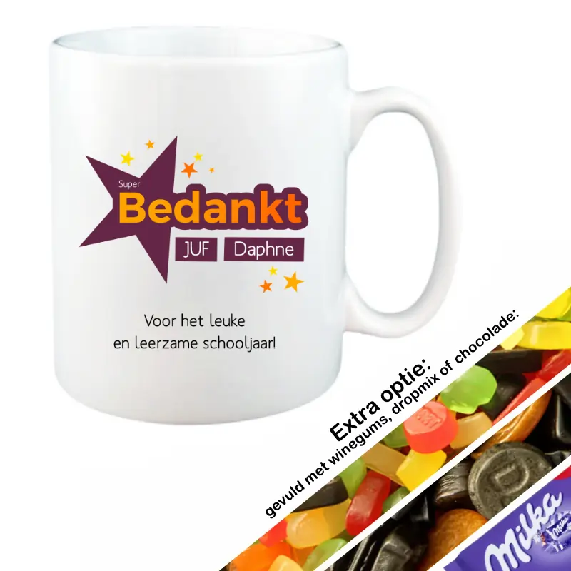 Deze witte mok met de tekst “Super Bedankt  juf” en de naam van de juf is hét perfecte cadeau! Je kunt er ook je eigen boodschap aan toevoegen, zoals: “Bedankt voor het leerzame schooljaar!” Zo maak je de mok extra persoonlijk en speciaal.