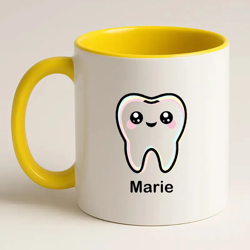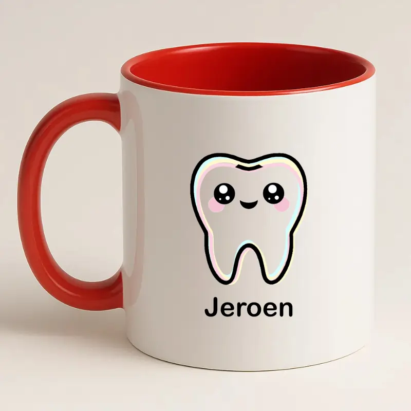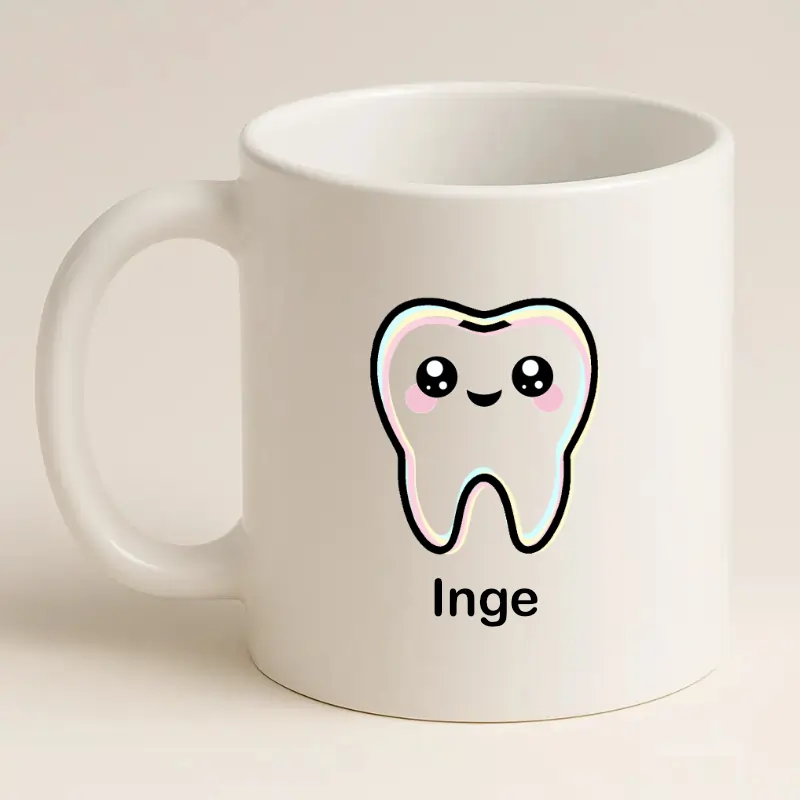 Op deze gepersonaliseerde mok voor tandarts staat een speelse cartoon kies, direct herkenbaar en grappig, met daaronder de naam van jouw favoriete tandarts, mondhygiënist of collega. Zo wordt een simpele koffiemok omgetoverd tot een uniek en bedrukte mok.