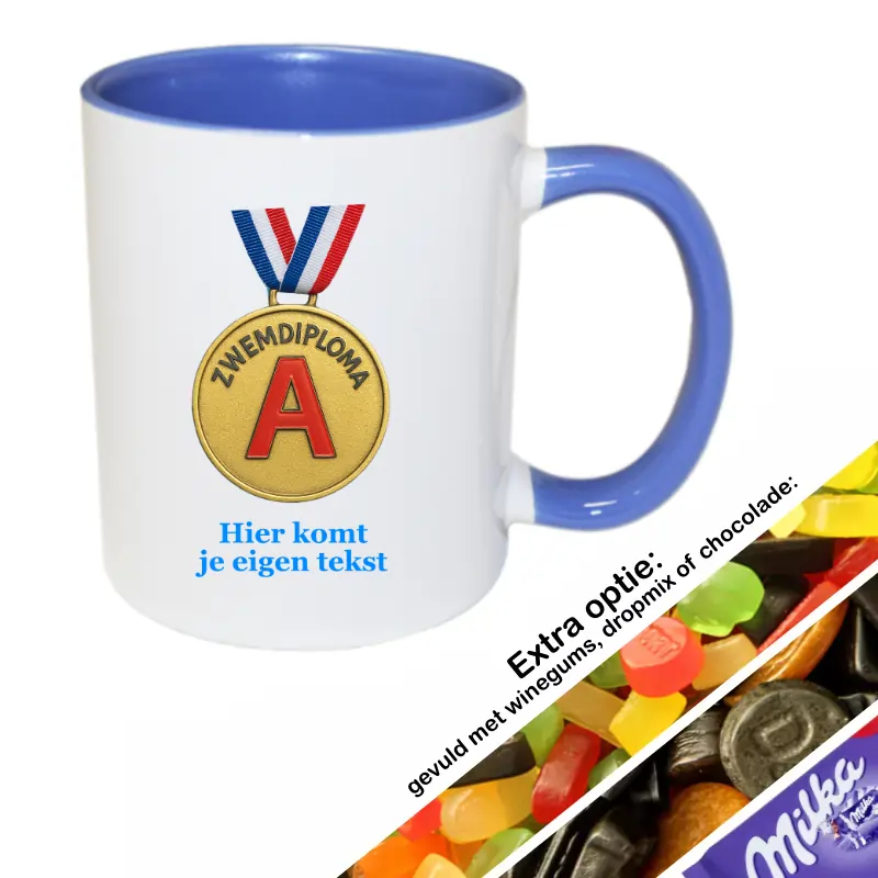 Deze Medaille Mok met blauwe details is het perfecte cadeau voor afzwemmen of als feestelijk aandenken aan het behalen van Zwemdiploma A.